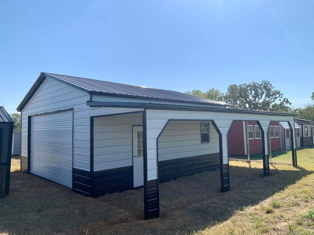 Custom metal building! 32’ X 25’ X 10’/8’ featuring a Vertical Style Roof, Black Wainscoting, 16’ X 8’ Rollup Door, (1) 9 Lite Walk-in Door, and (1) 24” X 36” Window with grids! Cash Price $14,753 Installed // Deposit $1,475.30 // No credit check financing starting at $550 monthly!