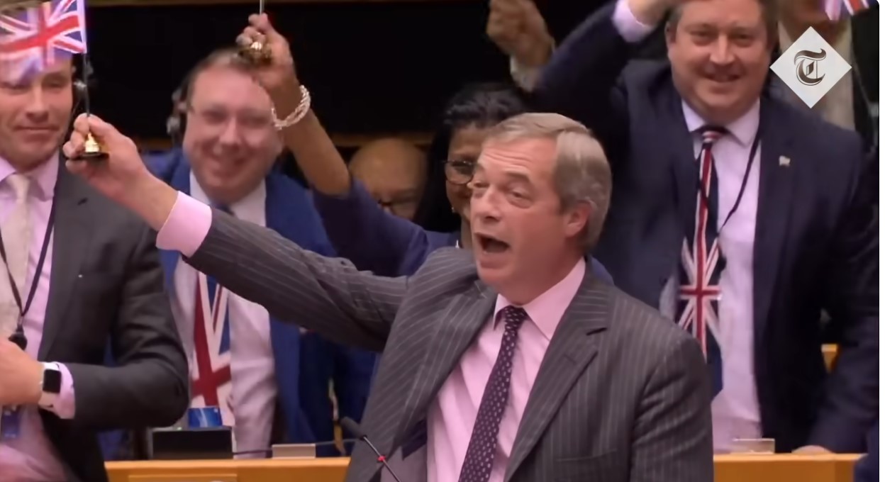 Farage concluded his speech by declaring, “I know you’re going to miss us. I know you want to ban our national flags, but we’re going to wave you goodbye.”